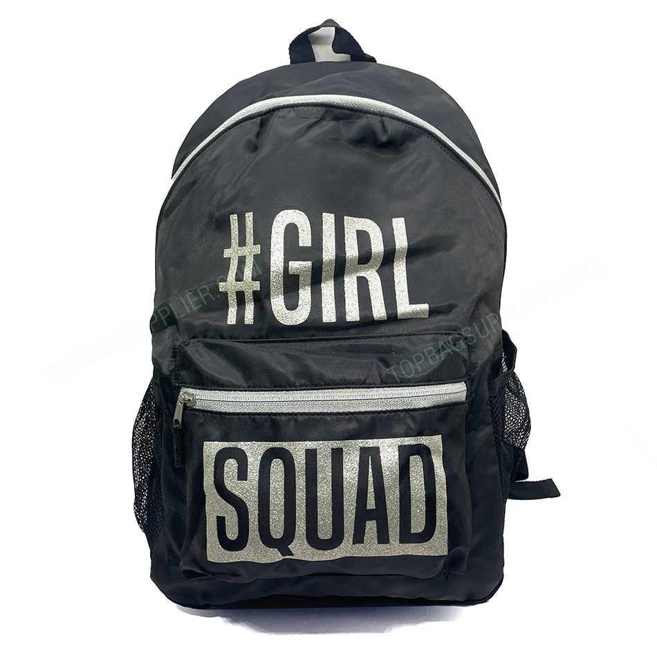 The backpack/school bag is a practical and ergonomic choice for carrying school materials. The simplistic, classic design means this backpack will make sense wherever the day takes you. It’s also a great travel bag. Comfortable padded straps make it easy to sling and wear. The ergonomic shape rests perfectly on your back or shoulder. And there’s comfort in knowing that everything you need to maximize your day is right there at your fingertips. Children's Place Black Squad Girl Backpack -Customized size -Customized logo -1 front zipper pocket -1 main zipper pocket -2 side mesh pockets -Back pad