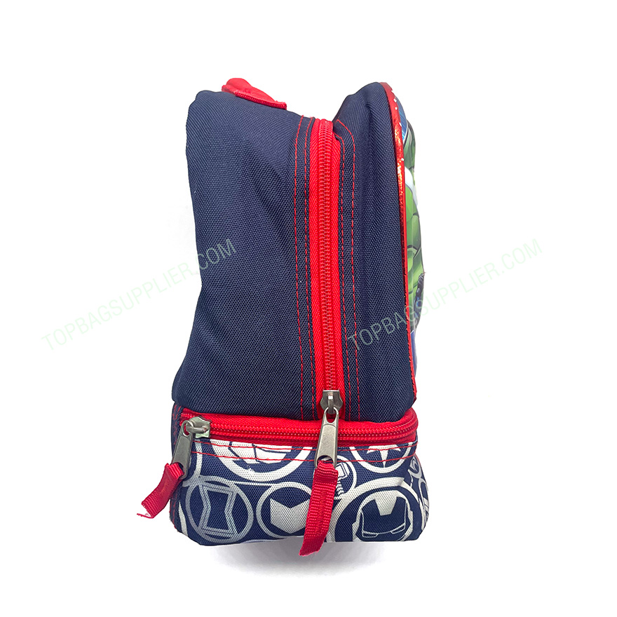 Insulated lunch bag for kids designed to keep food and drinks at a desired temperature for a certain period of time. Marvel Universe 6D Laser Dual Compartment Lunch Bag -Customized size -Customized logo -2 main zipper pockets -Insulated lining