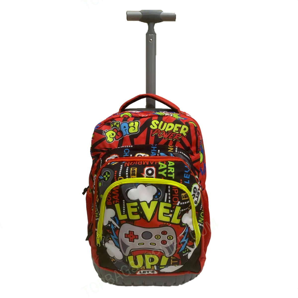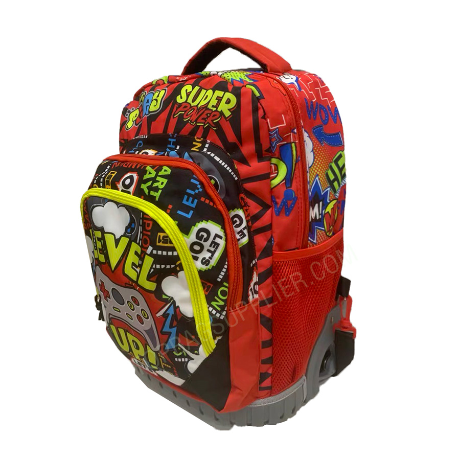 Zaino Mate Child Trolley Bag This rolling backpack looks cute with a geometric pattern that is made of high quality and durable Oxford, which is waterproof, so it can protect your stuff like a laptop from rain. The trolley is made of sturdy and aluminum alloy for carrying heavy things. Practical design, very suitable for primary school students, also suitable for travel, school or daily use. If you have any questions about our trolley backpacks, please feel free to contact us. -Customized size -Customized logo -2 Front pockets -1 main zipper pocket -2 side pockets -Back pad